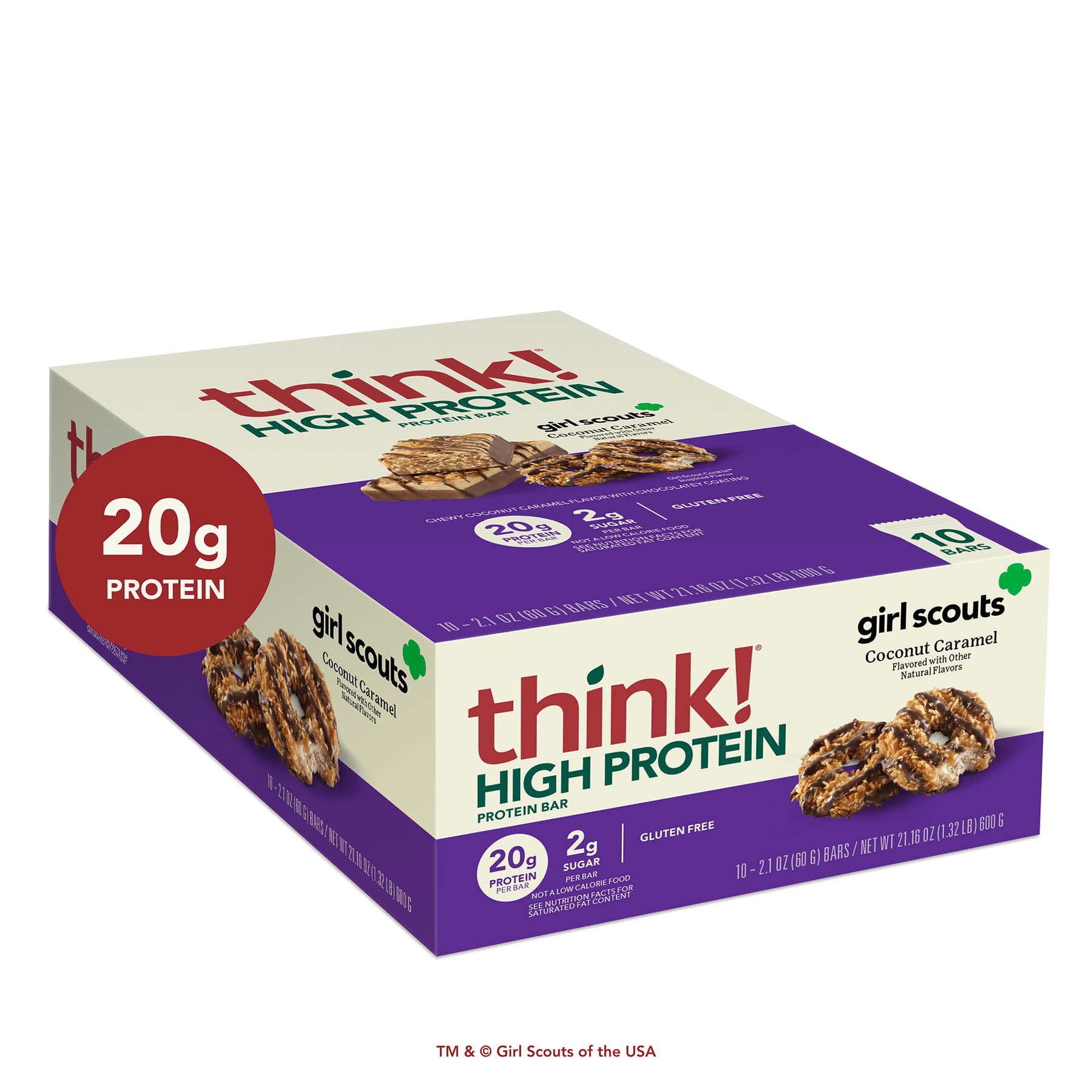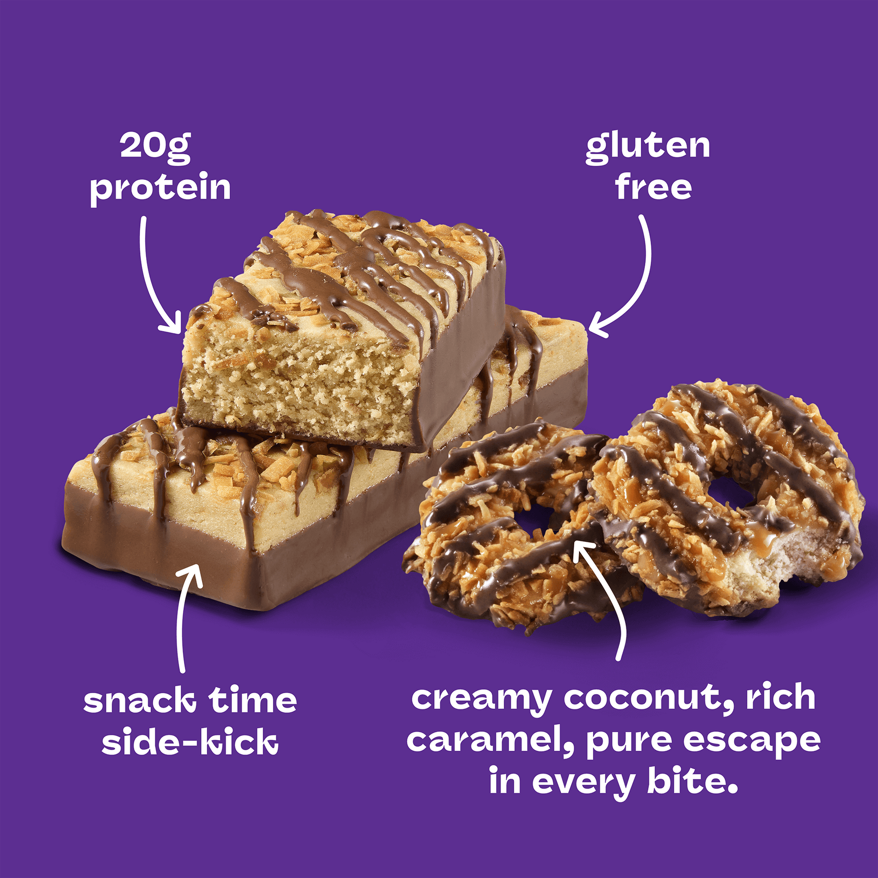 Some things shouldn't require a lot of thought, like choosing a delicious, protein-packed snack! Every Girl Scouts Coconut Caramel think! High Protein Bar delivers deeply satisfying taste and texture with 0g of sugar* alongside 20g of protein. Full of the Girl Scout Cookie inspired flavors of soft, chewy caramel, toasted flakes of coconut, and rich, chocolatey drizzle, you’ll never overthink snack time again!
